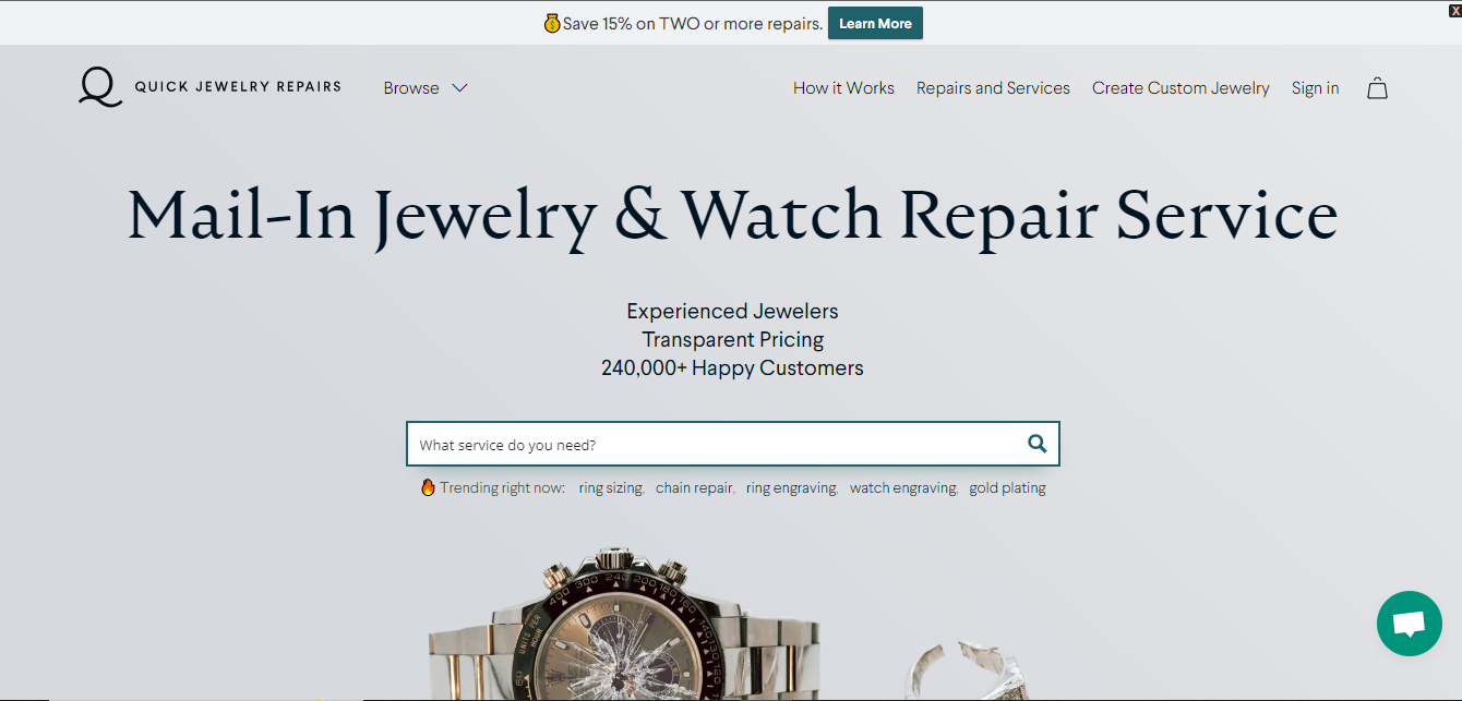 In 2023, we developed the Quick Jewelry Repairs website, which provides mail-in jewelry and watch repair services. The platform is designed to offer transparent pricing and seamless user experience for customers. Our team worked on the branding, UI/UX design, and content writing to create a user-friendly interface. The WordPress-based site is integrated with APIs for easy navigation and service booking, with hosting provided by Tech It Expert