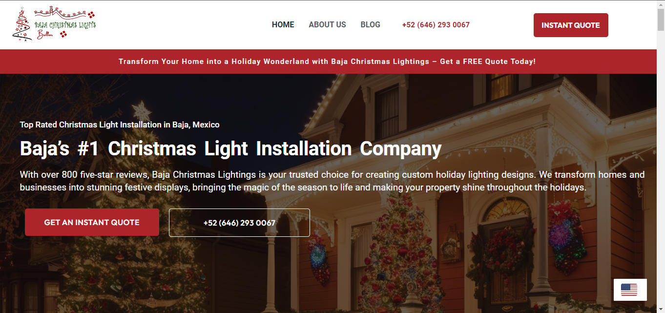 In 2024, we developed Baja’s Christmas Light website to provide comprehensive Christmas lighting installation services. The WordPress-based site showcases stunning custom lighting designs for homes and businesses, offering seamless user experience through API integration for real-time quotes. From branding and UI/UX design to content writing and hosting, we ensured the platform was both visually appealing and highly functional to attract new clients during the holiday season.