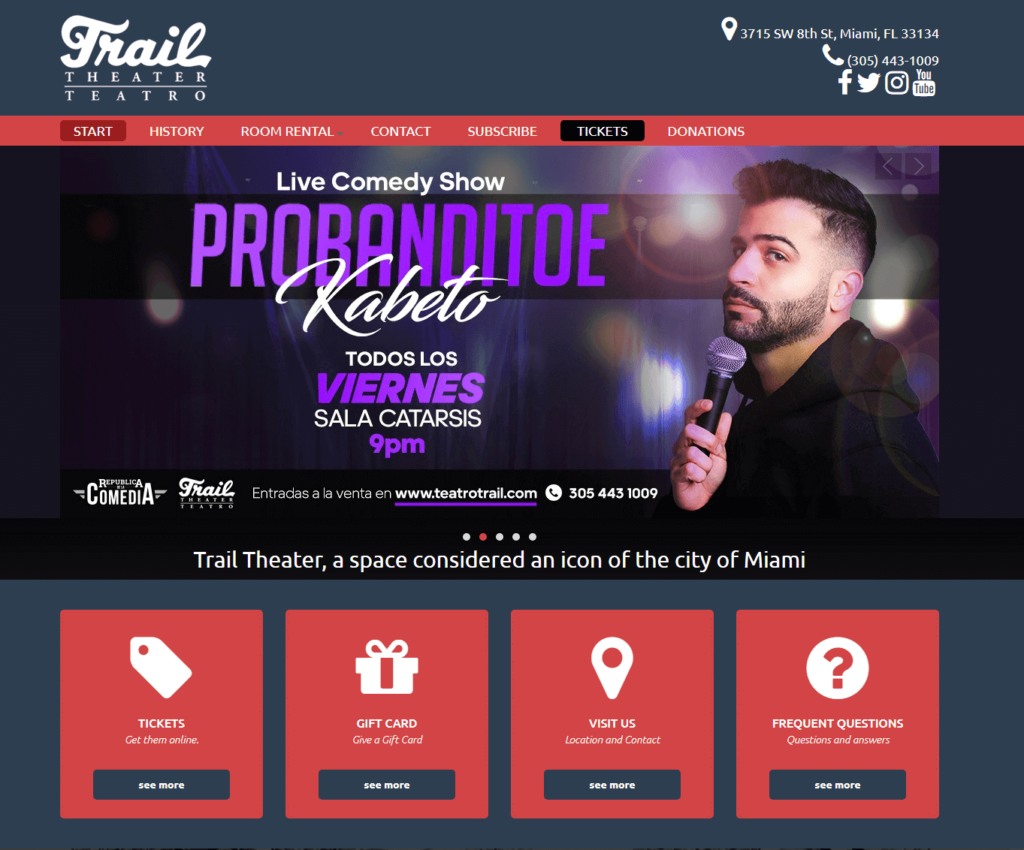 Trail Theatre is an iconic cultural space in Miami, known for its live comedy shows and entertainment. The website, developed in 2023, provides an immersive digital experience with easy navigation for users to purchase tickets, gift cards, or find event information. The branding and UI/UX design were tailored to capture the vibrant and dynamic spirit of the theater.